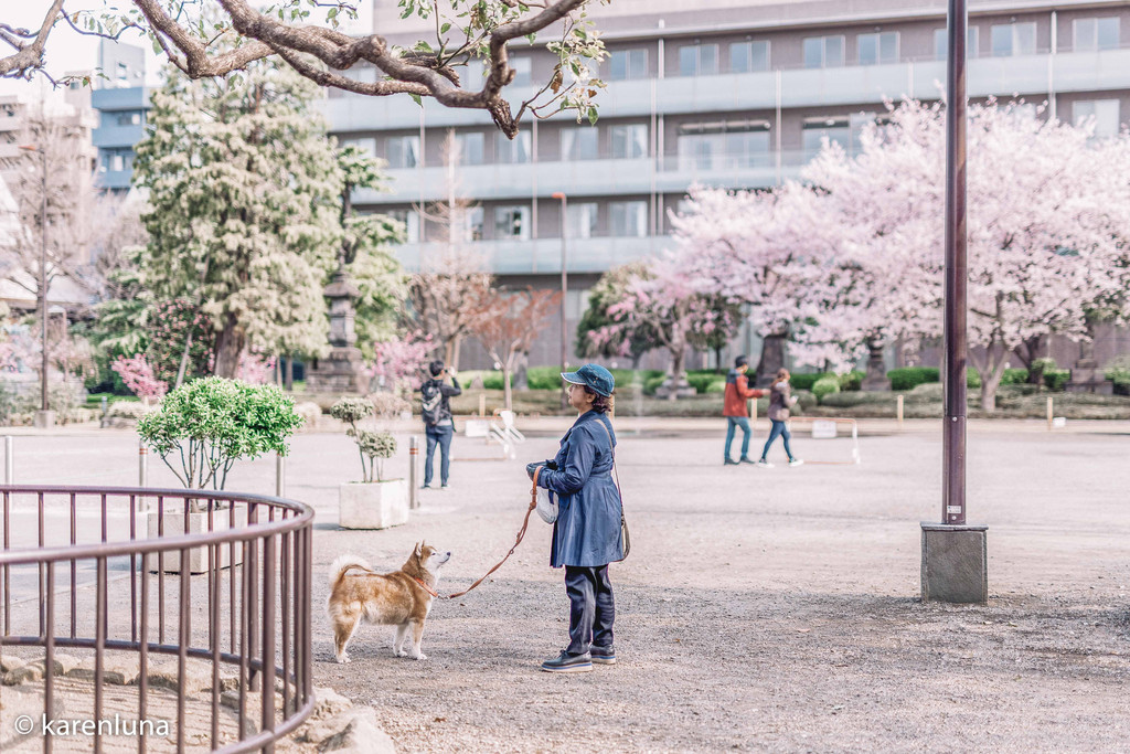 不过相比来说,我更推荐清晨前往。要知道偌大的桥头美景只有我一人独享,这样的僻静悠闲在这樱花季的东京是有多么难得。即使有些过往的行人,也只是骑着自行车的上班族匆匆停下脚步咔嚓几张,或者牵着柴犬的附近居民在树下悠闲遛弯。