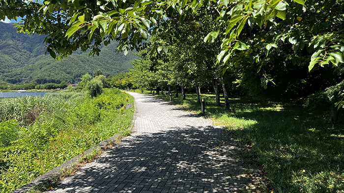 骑行路线主要分两条,一条是环湖路线,一条是浅见公园及网红街路线,如果时间充裕可以两条都走。我和老婆走的是环湖路往返17公里,算上吃中午饭和排队坐富士山全景缆车、大石公园赏花和购物一共5小时,骑车的优势是可以走景色优美的湖边观景路,随时停下来拍照,这是汽车不能比拟的。