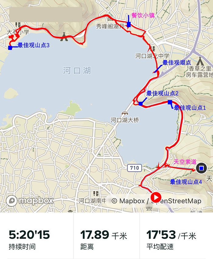 环湖线往返17公里,主要有四处观山、湖拍照点、一处餐饮小镇还有一处山顶鸟居及瞭望台(有缆车可以上山),都是最经典的拍照打卡的位置,