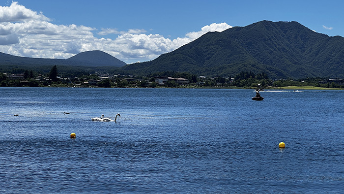 观湖点,这里是一个水上划艇码头,虽然看不到富士山,但是湖面这里最为宽阔,而且有天鹅作伴!!!