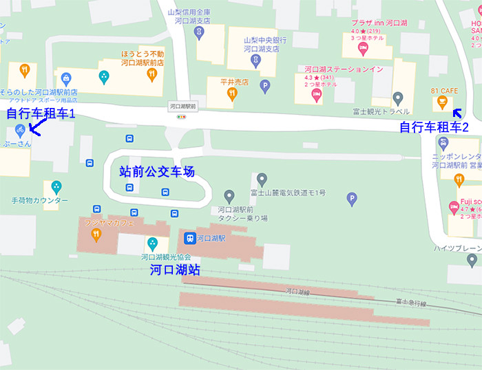 河口湖站是铁路和巴士一起的综合站,自行车骑行的话可以在附近两处租到自行车(普通车租一天2000日元左右,相当于rmb100元,租电助力车会贵一些但是值得,如果你时间足够并且两条线路都打算走的话,推荐你租电助力车)。81cafe也可以租自行车,里面服务员是两个小姐姐和一个小哥哥都很可爱。自行车租赁点就在河口湖站附近,见下图