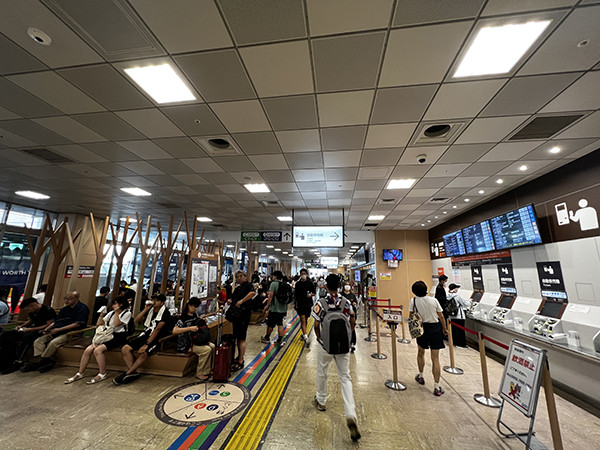 从新宿站(Shinjuku Expressway Bus Terminal)乘坐巴士前往河口湖站(Kawaguchiko Sta):坐地铁到新宿站南向出口,过马路到对面的高速巴士站四层买票乘车。暑期最好在网上提前买票网址:(见巴士时刻表上角) ,一定买往返票!暑期不买往返票可能出现没有车票的情况。现场购票在这栋快速巴士大楼(EXPRESSWAY BUS)的四层,里面有会中文的小姐姐耐心的告诉你怎么买票。见附图