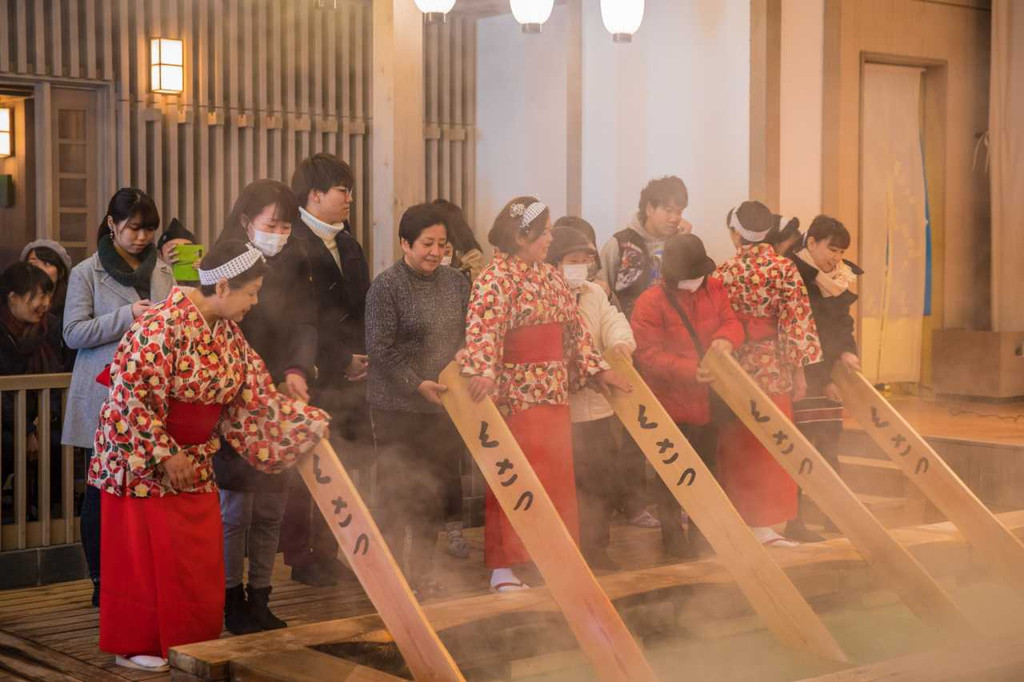 草津的传统文化不少,其中最具代表性的一项叫做“热乃汤”,也就是“汤揉”的表演。当地人为了降低较烫的温泉温度,在“汤长”的号令下,赤膊上阵,手持一块长板搅拌池内的温泉,并哼唱着劳动号子,目的是要达到使温泉中药物元素混合均匀,降低温度和提高疗效的效果。