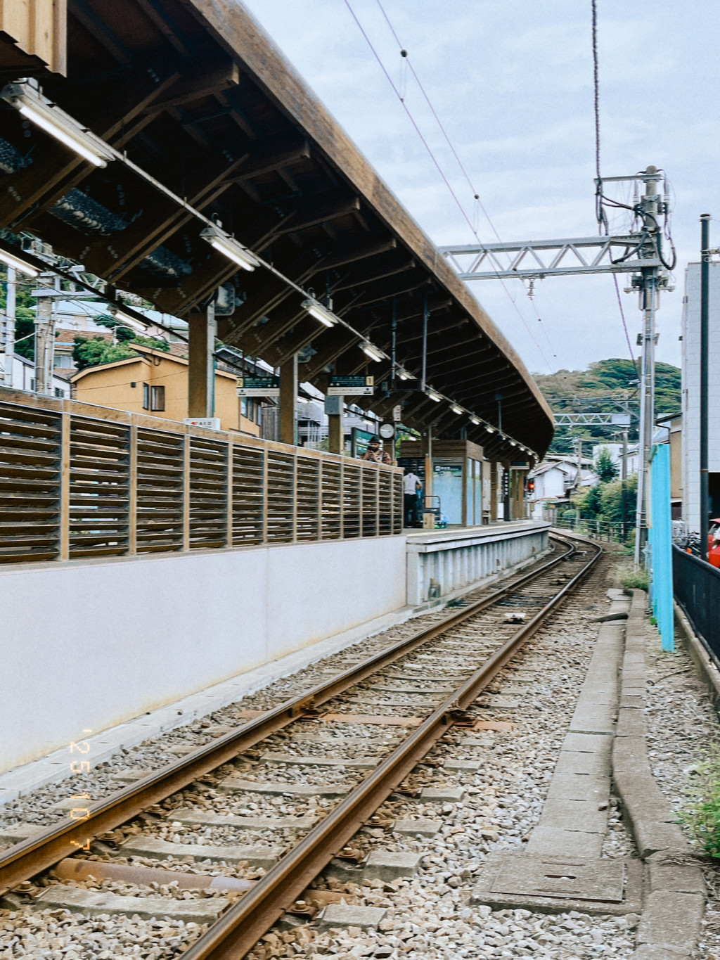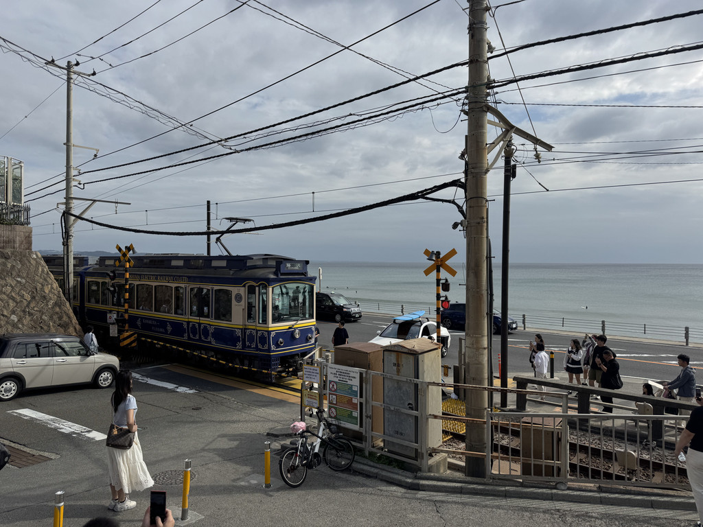 江之岛电铁(简称江之电)是一条穿梭于江之岛海岸线及小镇间、连接藤泽与镰仓的铁路,是本地的代表性景观之一,兼具日常交通和观光属性。电车大概15分钟一趟,是比较带感的旧车型,可以说就是绿皮车,木质地板和座椅,慢速摇晃的节奏,都充满着怀旧风情。电车会从狭窄的居民区中穿行、靠着海岸边行驶。