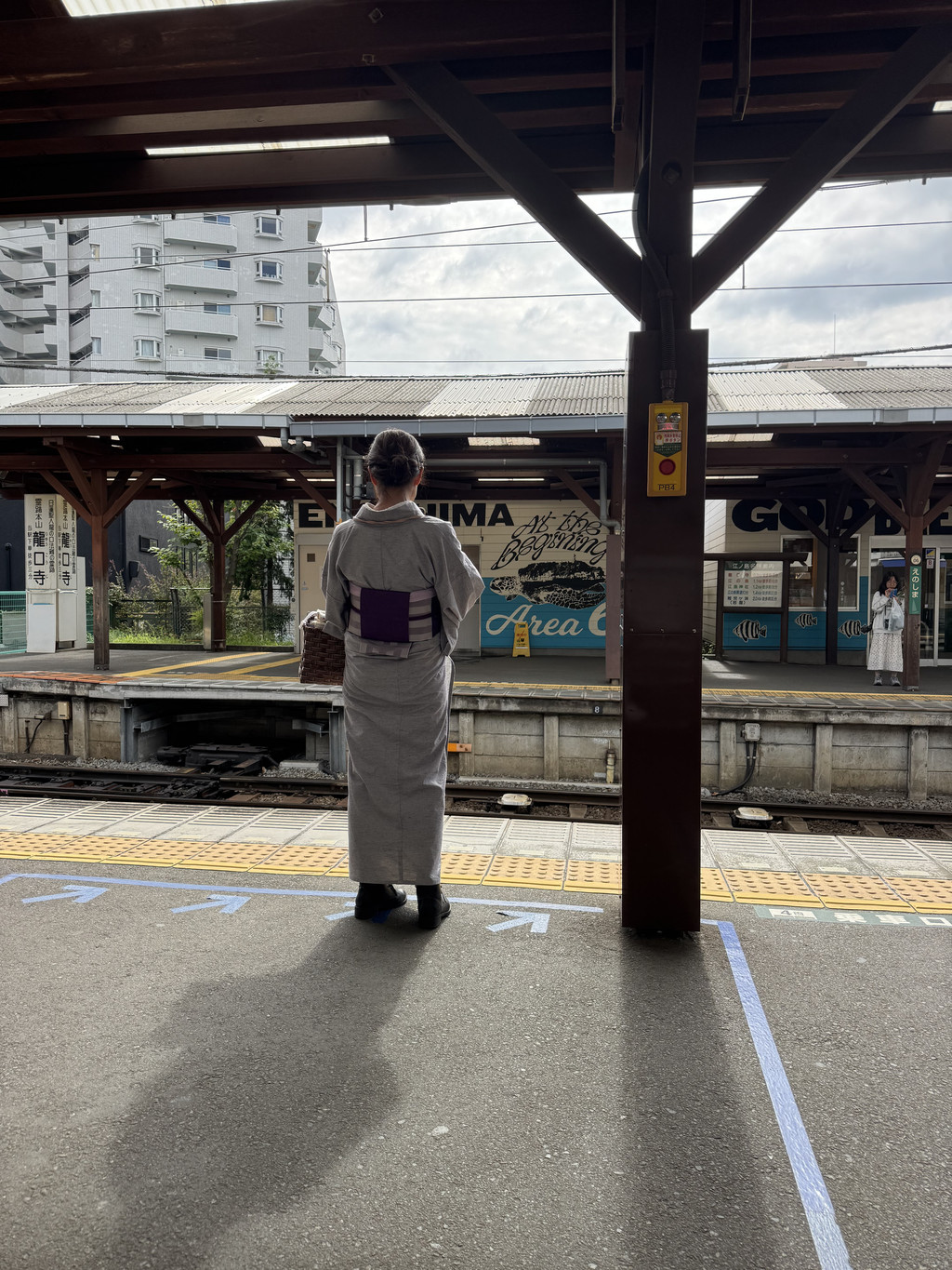 电车从藤泽站出发后没几站就到江之岛站了。木质的车站、古老的电车、有岁月痕迹的长凳真是太有感了。