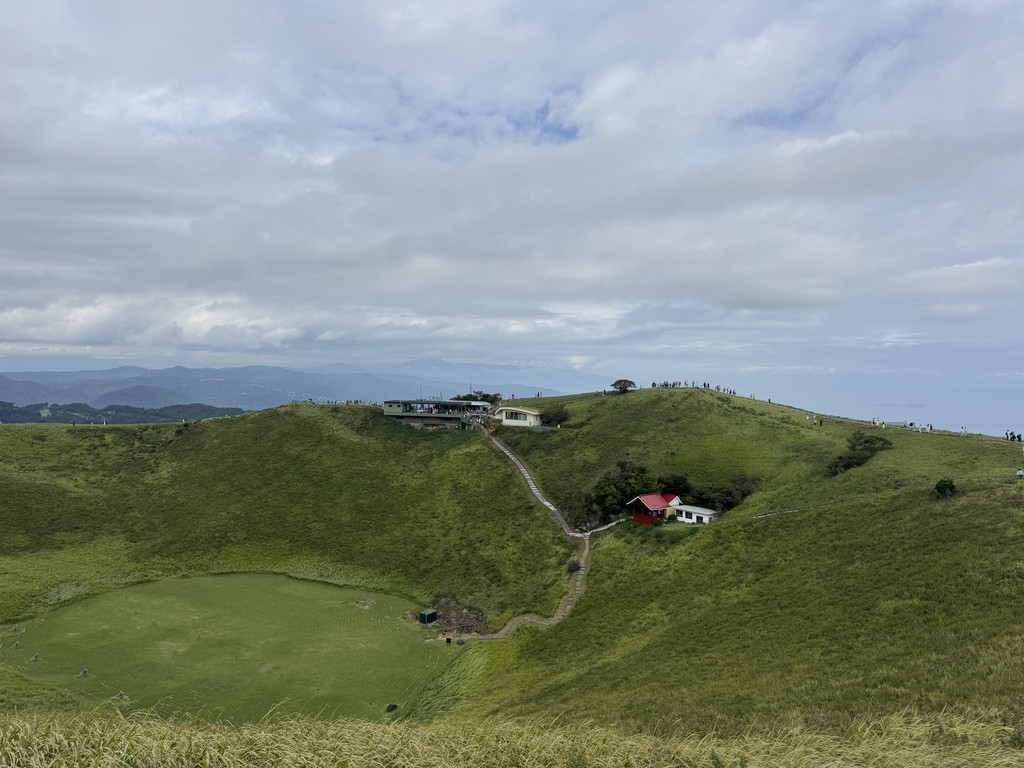 山顶有步道,环绕火山口步行一圈加上不停地拍照大约一个多小时。青山、绿草、蓝天、白云,清风构成了大室山无比诱人的画卷。连绵的群山还有绵延不绝的白云群,山脚下是熙熙攘攘的村落群山的远方是蓝得醉人的连接天空的大海,而我们就站在这个夏日抹茶冰激凌的火山口。据说的富士山没看到,但也收获了不错的风景。