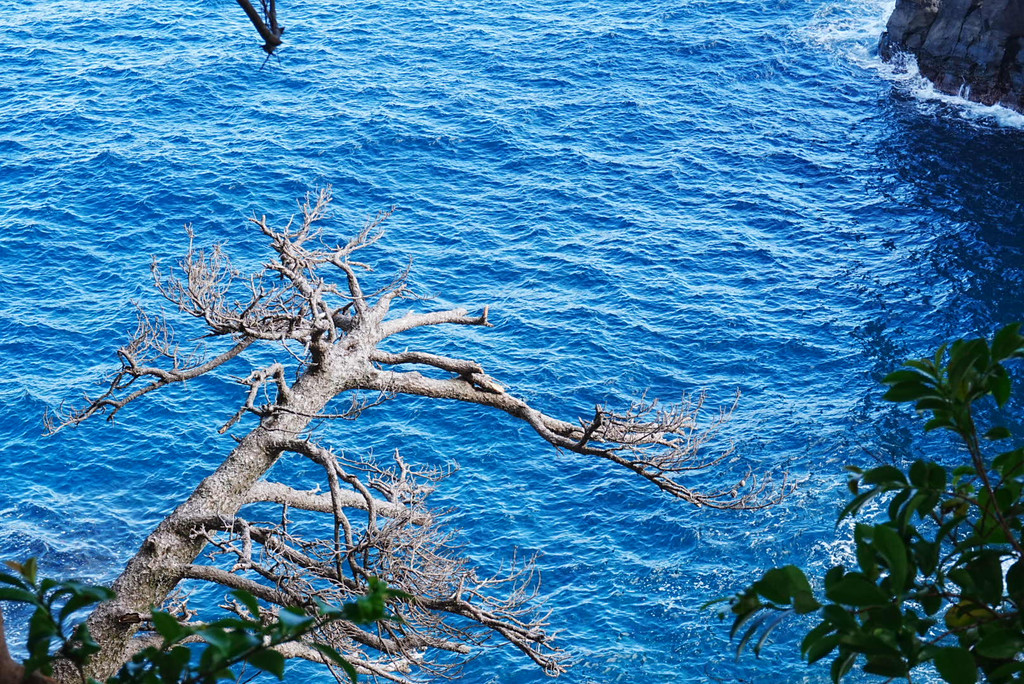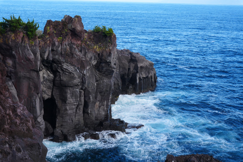 城崎海岸的海岸线蜿蜒曲折,黑礁石经历了千年的海浪拍打,牢牢扎根在澄澈的海水中。有两条小路可达门胁吊桥 :一条海岸步道,一条森林步道。我们先沿着海岸步道漫步,一侧是壁立的青山,蕨类植物从石缝里探出头;另一侧是无垠的大海,偶尔能看见海鸟舒展翅膀掠过海面。湛蓝的海水,黑色的礁石,惊涛拍岸,几只海鸥飞过,世界静止,一幅壮丽的景观。回程改走森林步道,两旁郁郁葱葱的原始森林树木高立,虫鸣不断。这里基本上怎么拍都挺好看的,主要是各个景物有层次感,色彩也丰富。