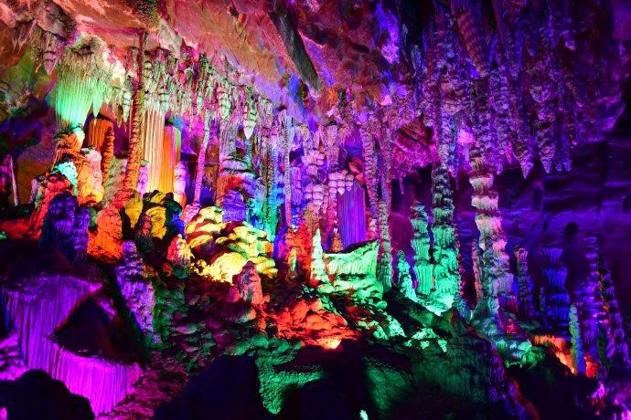 “荡舟水府迷宫”长1000余米的地下河流,霞光映湖,九转八折,乘车小船曲径通幽直达龙湖。湖岸万年形成的石