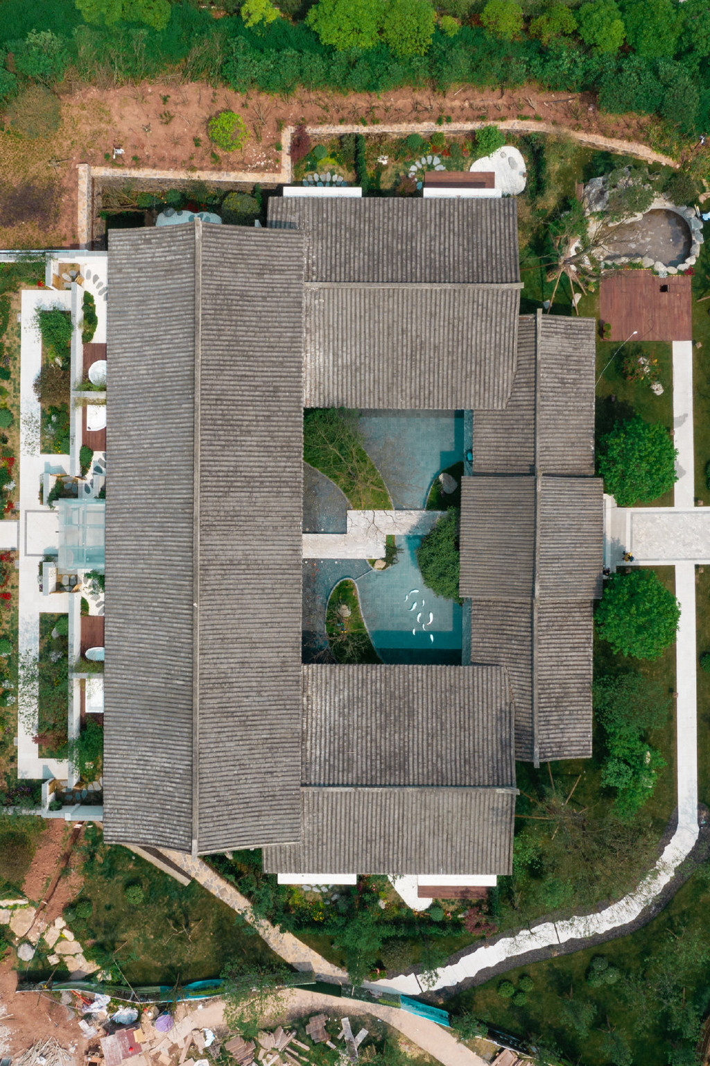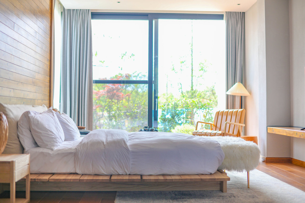 点击此处添加图片说明文字我特别喜欢民宿中庭天井式的设计,中庭内打造了一个以水为主体,回廊平桥相呼应的镜面水景观,水池中间嵌入三块弧形绿地,三棵型树作为景观骨干,配上密植翠云草似地毯,细致,清爽。回廊四周分别是6个房间入口,每个房间均安装了整面落地玻璃,使整个中庭景观净收眼底。
