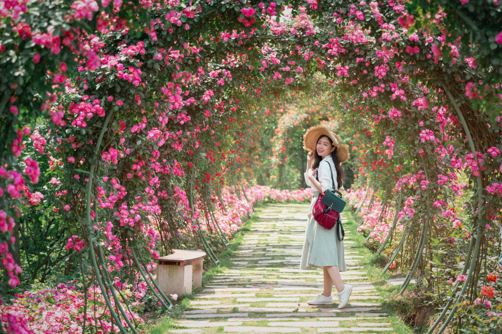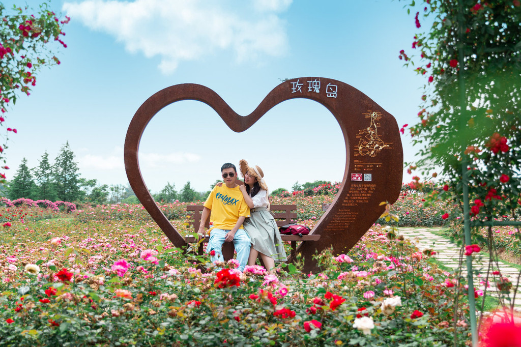 点击此处添加图片说明文字除了分块种植的玫瑰花,岛上还打造了拱形花环长廊,看上去非常的梦幻美妙,特别适合拍照打卡。走在其中,真的有置换在梦幻花海里的感觉!玫瑰花象征着美丽、浪漫、爱情,所以这里也是拍亲子照和婚纱照的绝佳之地。
