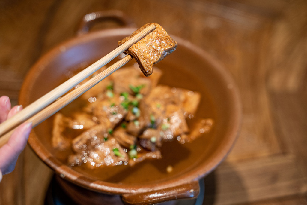 永泉炭火豆腐,用黑猪五花肉炸油,古法制作的老豆腐,滑入锅中两面煎的微黄,在加水调味,然后在炭火中慢慢煨至入味。这道菜肴做法颇具江南特色,香嫩的豆腐吸入了带着猪油的汤汁,无比的鲜美。