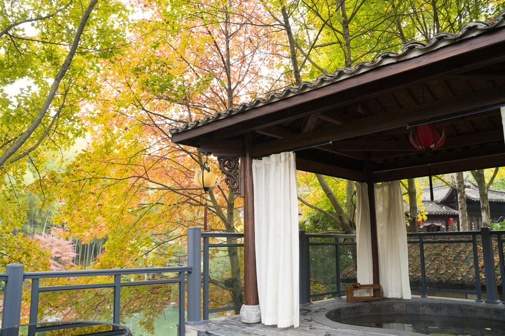 一场秋雨一场寒,山间的风都带着些许凉意,此时正是泡温泉的好时候。铜陵有八宝,温泉为第九宝,故而取名九宝温泉。步入温泉区,整个温泉区给我的第一印象便是自然的江南韵味,整个温泉区内,森林茂密,绿植环绕,而温泉区的建筑也是一如既往的明清时代的建筑风格。