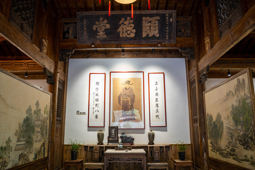 步入书堂内,两任相臣荆国公王安石的官服画像悬挂在正堂之上,画像两侧对联上写有:正身鼎革尊三代,独步风骚列八家,这也是对王安石生平最高的赞誉。画像上的荆公凛然正气,眼神中流露着睿智和立志改革的坚毅。历史的尘埃早己落定,谁也阻挡不了时代的步伐。
