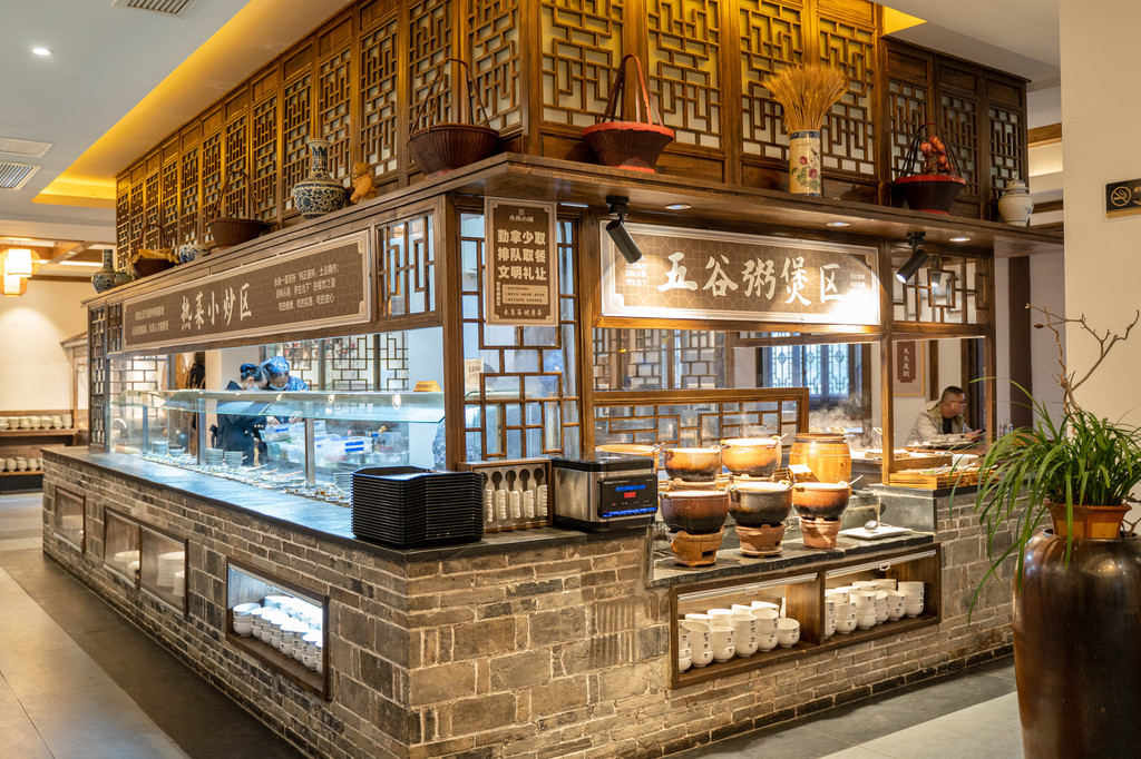 度假区内还有着一家自助餐厅,去过很多自助餐厅,但如此江南风的自助餐厅还是我第一次遇到。老式灰砖砌起来的自助餐台,在这里摆放着非常丰富的菜品,装菜的碗碟都是几十年前的老旧款式,菜的分量不大,所以每个人都可以选择更多的菜品,每一道菜都是地道的铜陵味道。