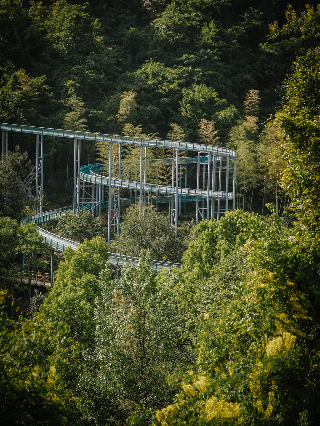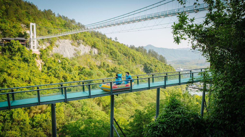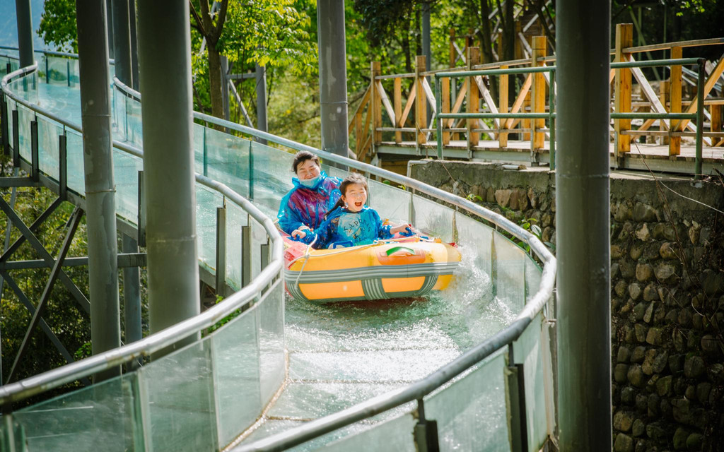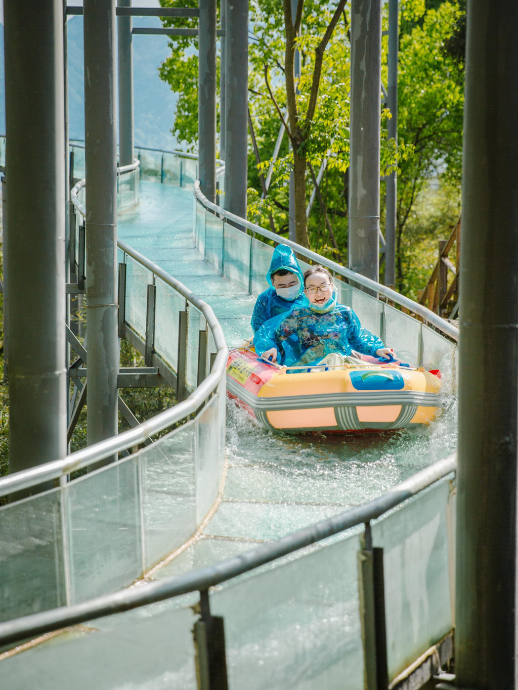 全程1350余米,首尾高差120余米的凌空漂越,引流了天然清澈的通天河水进入到透明的玻璃滑道里,穿上雨衣上船,就可以穿行在树林之间,随着水流顺势而下,眼前是一片青翠的山林绿阴,伴随着呼呼的风声、潺潺的水声、身旁簇簇作响的浪花追逐声和随时都能听到的尖叫声一路蜿蜒而行,紧张刺激感不言而喻。