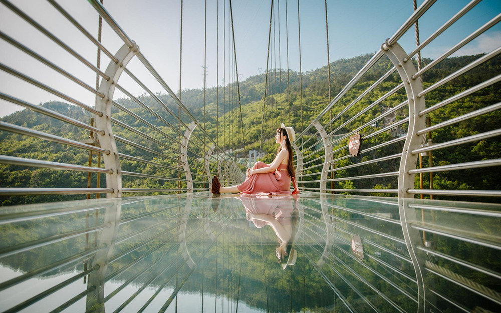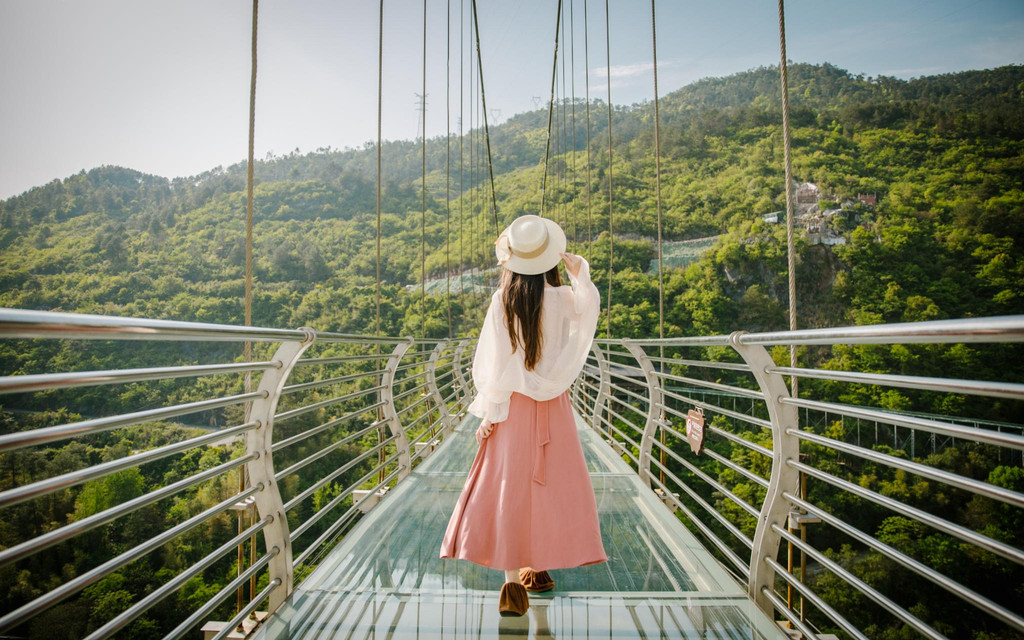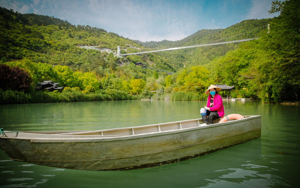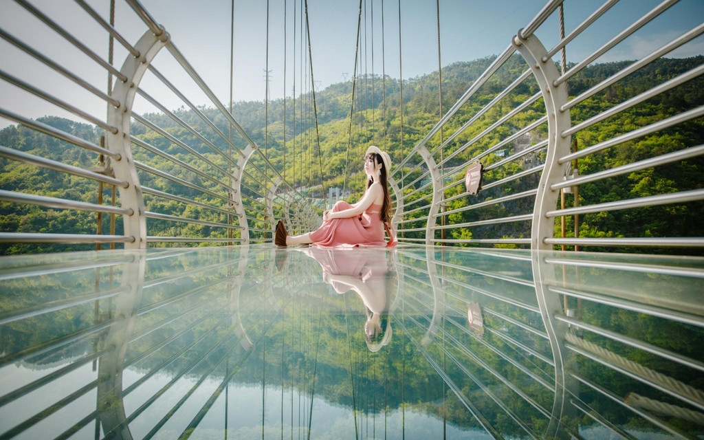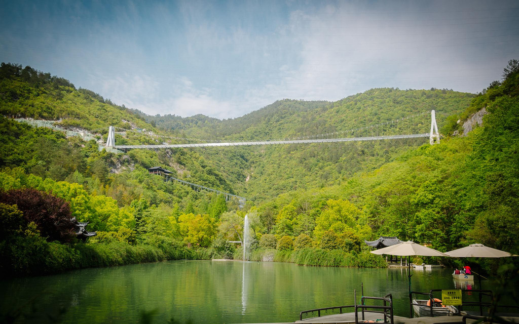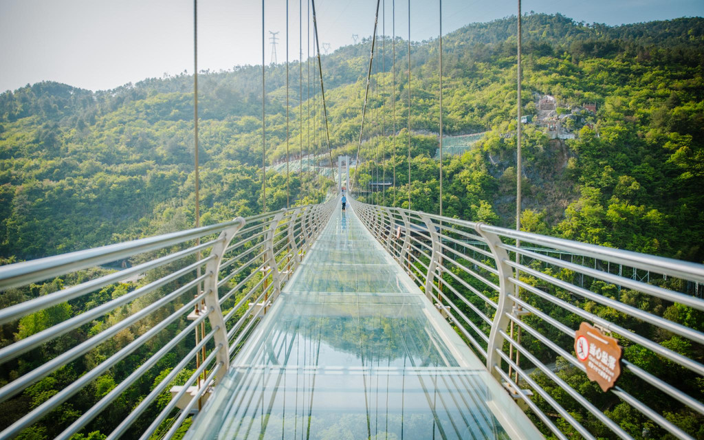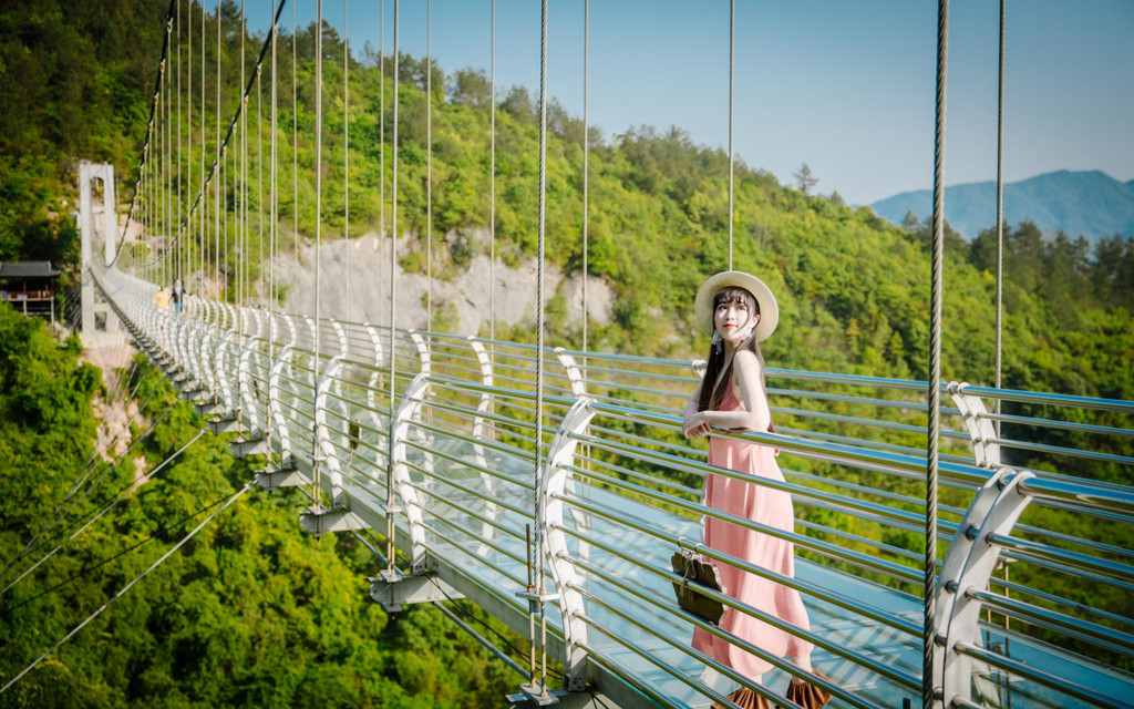 脚下是百米高空,眼前是缥缈山间的秀美景色,青山秀水,蓝天白云也都一览无余,在凌云天桥,与山水对坐,天高远阔,独享清欢。