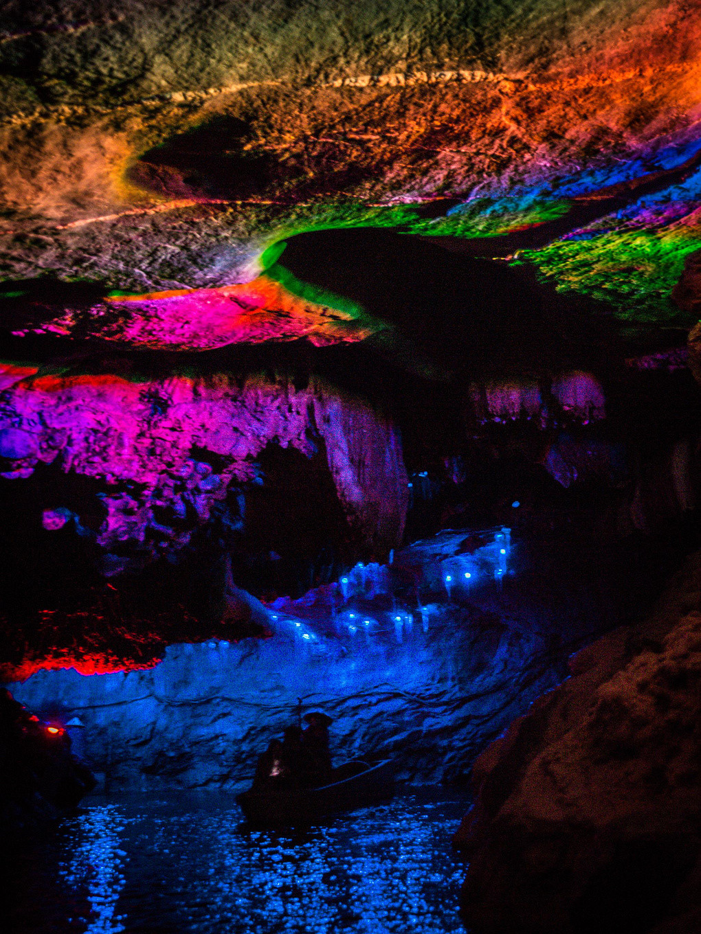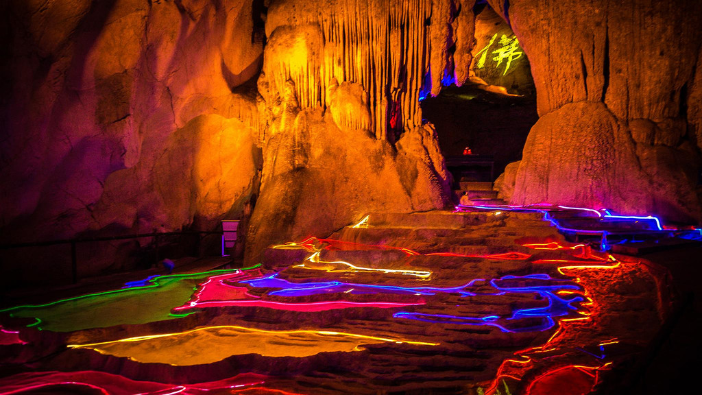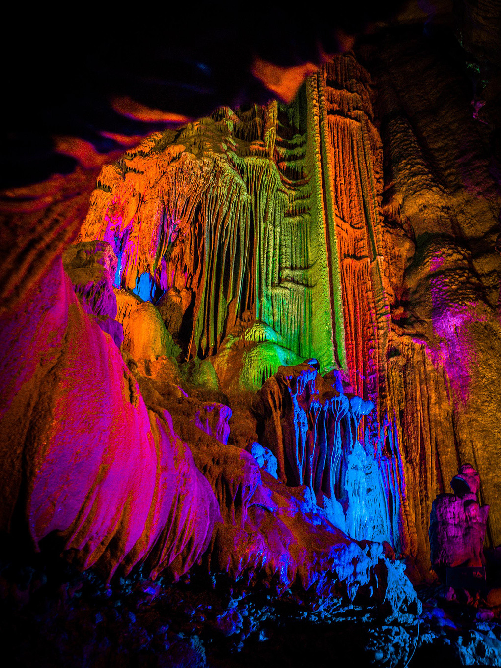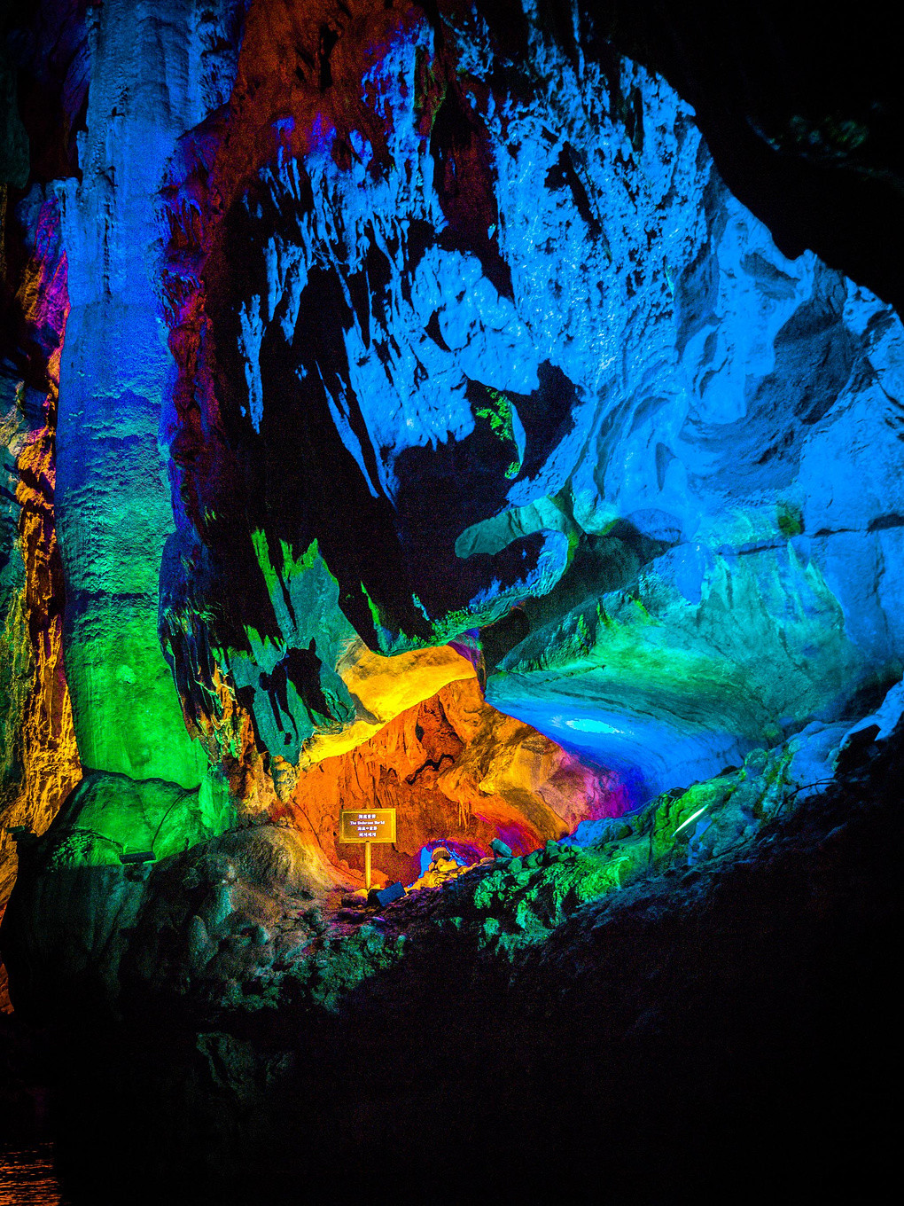 溶洞里面布满了五颜六色的彩灯,使幽暗的暗河显得五彩斑斓,仔细瞧着,洞内的每一处景点似乎都千姿百态,妙趣横生。