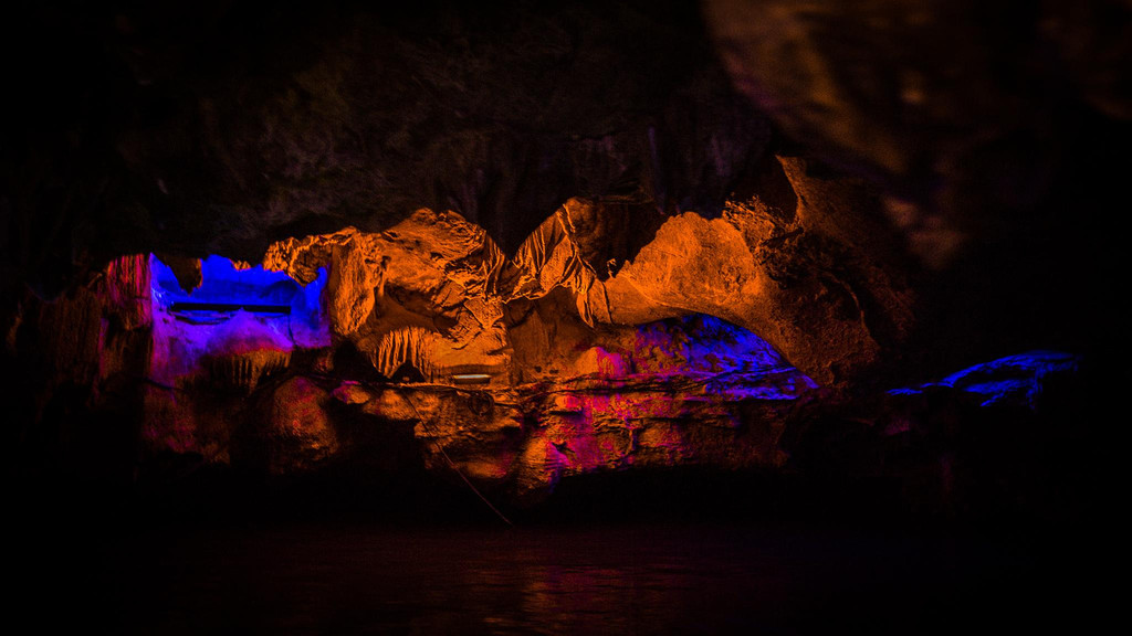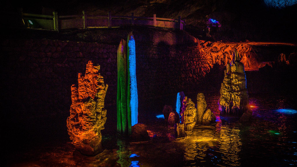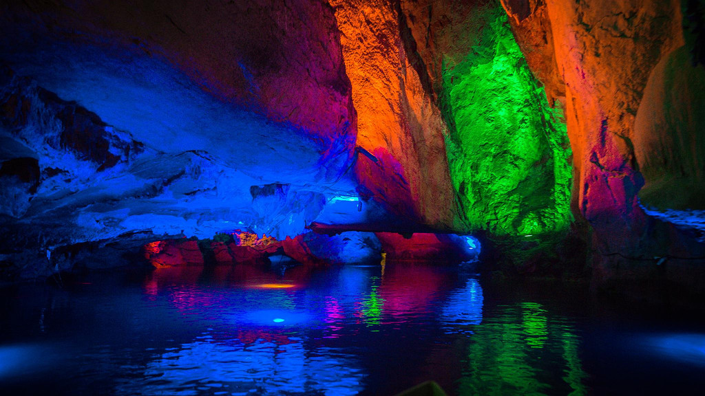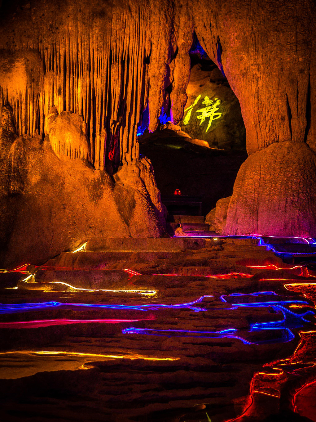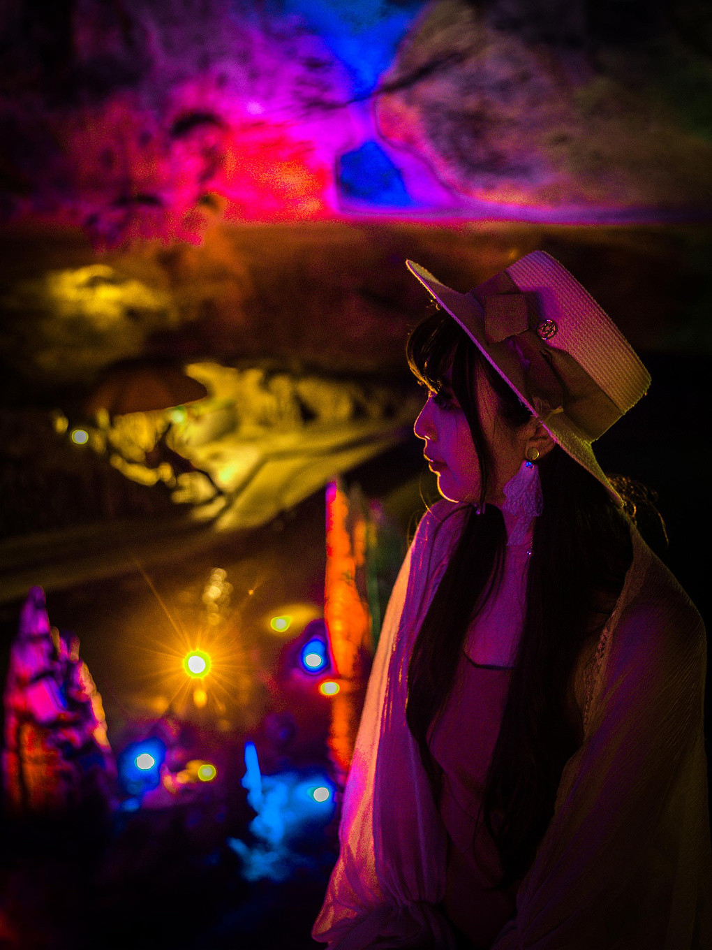 溶洞里面布满了五颜六色的彩灯,使幽暗的暗河显得五彩斑斓,仔细瞧着,洞内的每一处景点似乎都千姿百态,妙趣横生。