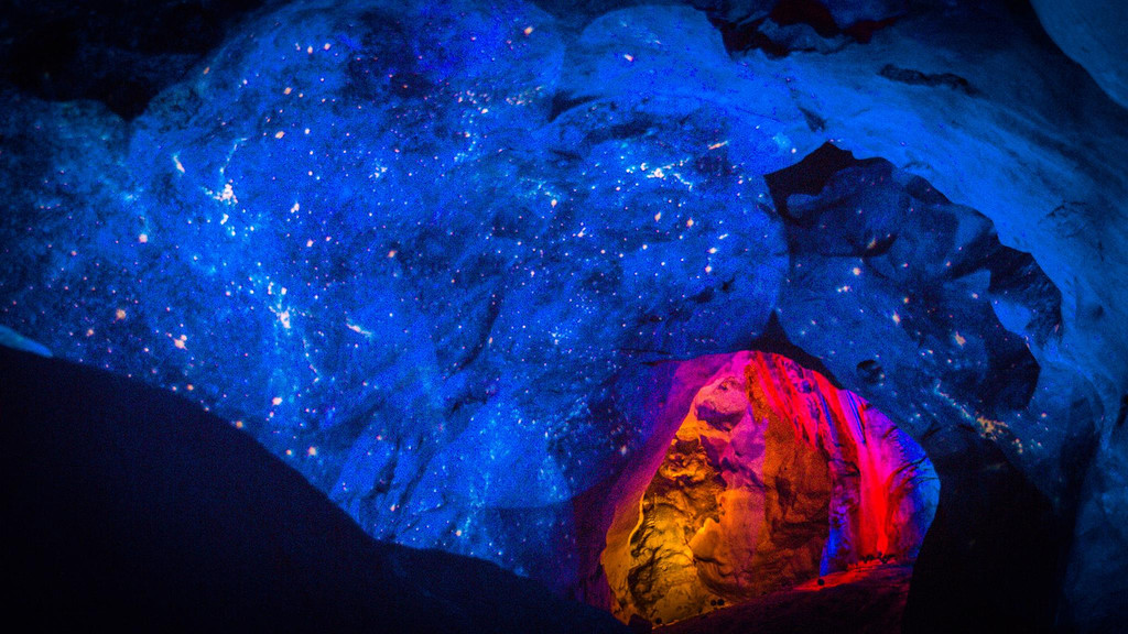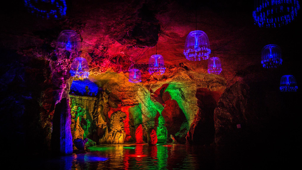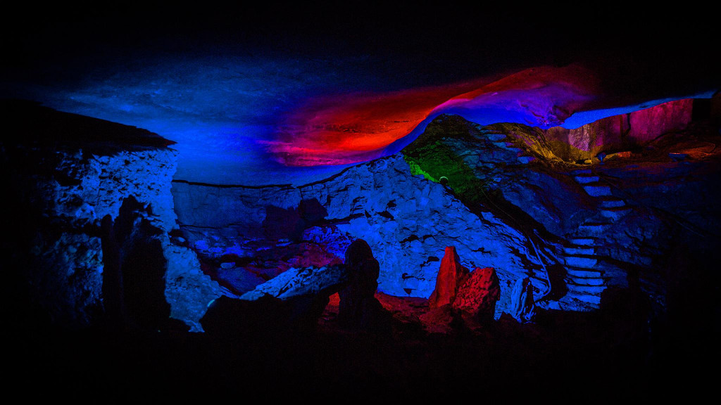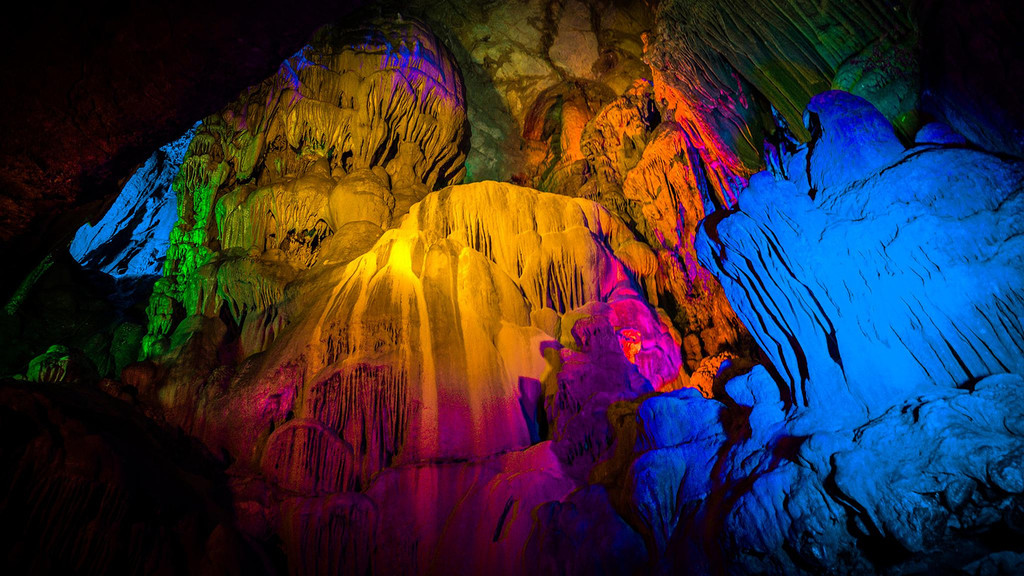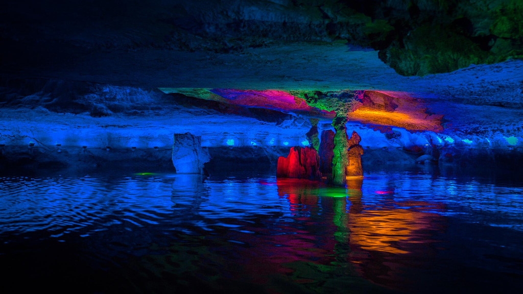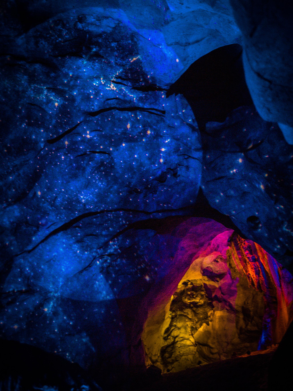 溶洞里面布满了五颜六色的彩灯,使幽暗的暗河显得五彩斑斓,仔细瞧着,洞内的每一处景点似乎都千姿百态,妙趣横生。