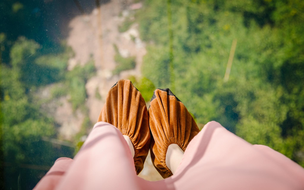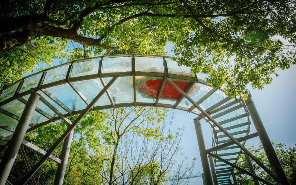 在桥上俯瞰,每块玻璃的透光率非常高,人走在上面就像悬空一样,有种凌波微步的错觉,不经意间瞥到一旁蜿蜒而下的玻璃漂流,更是情不自禁的倒吸一口凉气。