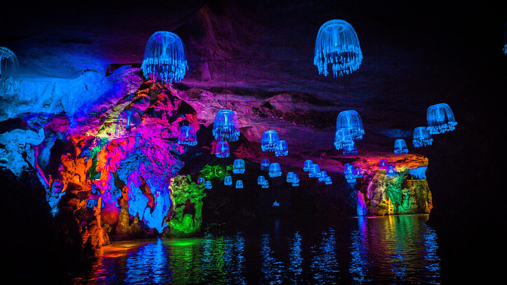 由远而近的蓝色水母群,拖着发着光的丝带一路蜿蜒,在空中蝶然飘舞,犹如璀璨星空诉说眨眼的秘密;
