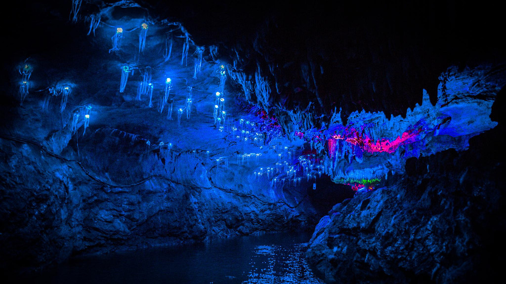 地下河水清澈透底,两岸千奇百怪的石柱林立,倒映河中,在各种彩色的灯光照射下熠熠生辉,这时候方能感叹“别有洞天”的童话世界,原来是如此般别致又醉人。