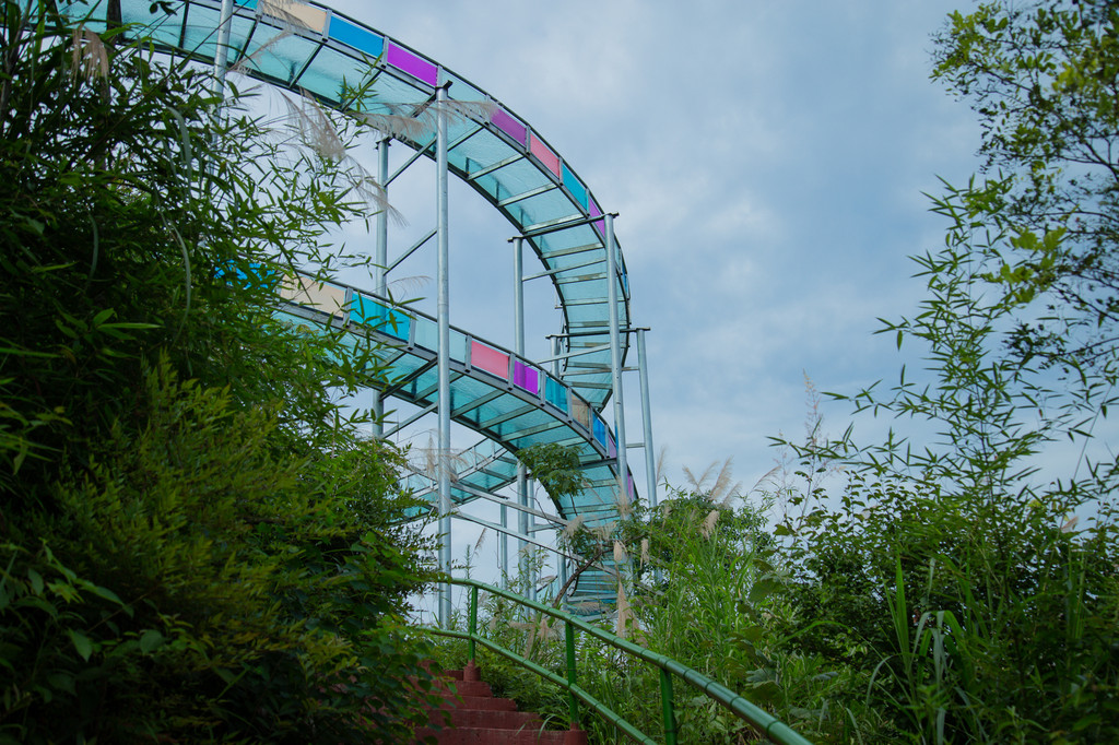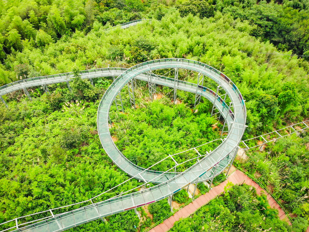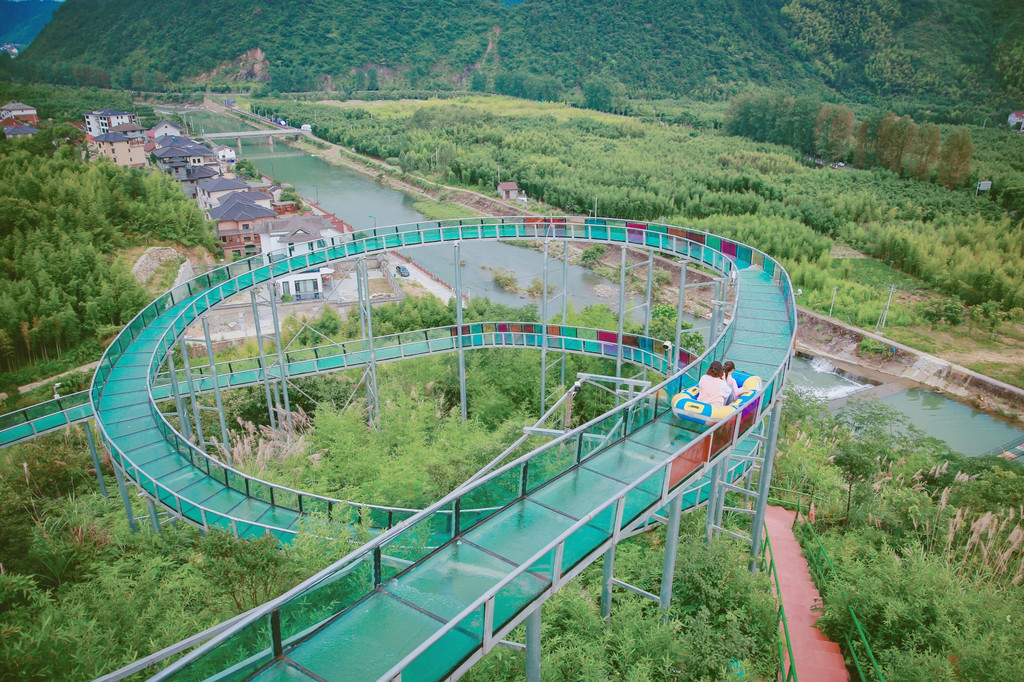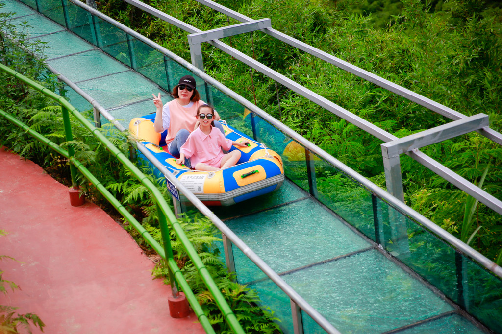 沿路,上山,便是心心念念很久的玻璃水滑道,这个网红漂流我已经关注很久了。需要爬一点山(大概两百个台阶吧),在一个小山上,有两个项目,悬崖秋千和水滑道漂流。坐上皮艇,顺着水流而下,穿梭在竹林间,凉爽的风迎面扑来,尖叫声回荡在这片山竹间!
