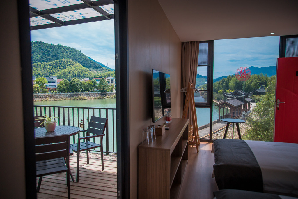 窗外犹如山水画,亭台楼阁,清澈的湖水倒影着青山,坐在阳台上,吹着阵阵微风,喝杯茶,生活就该如此惬意,太喜欢这样融在风景里的住宿了。在水一方集装箱民宿由39个彩虹色集装箱组成,以国粹麻将牌面命名的房号在细节上别具一格,生动灵活。
