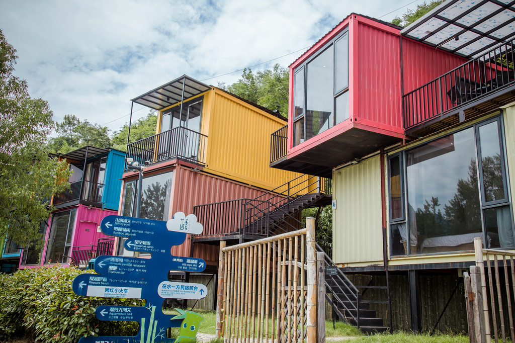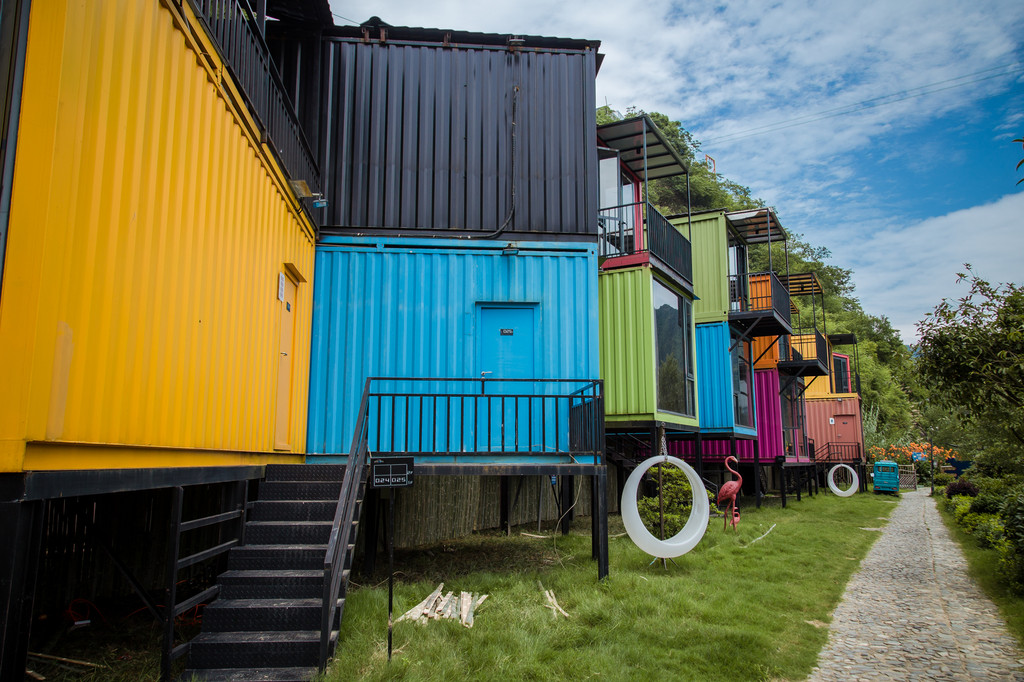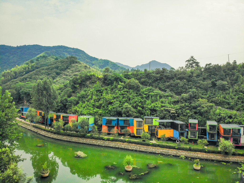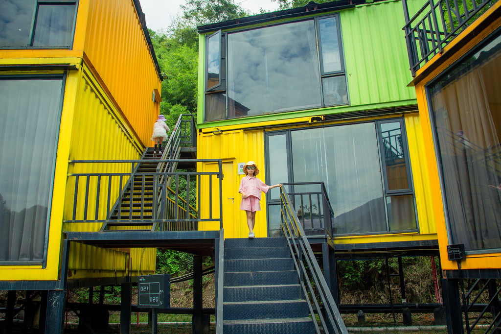 入住的是景区里的在水一方集装箱民宿,真正的依山傍水,在绿意怏然的山间,五颜六色的集装箱叠加在一起,特别显眼。落地窗外青山绿水的风景让人着迷。夜间一场篝火狂欢以后,星空下注定能睡个好觉!