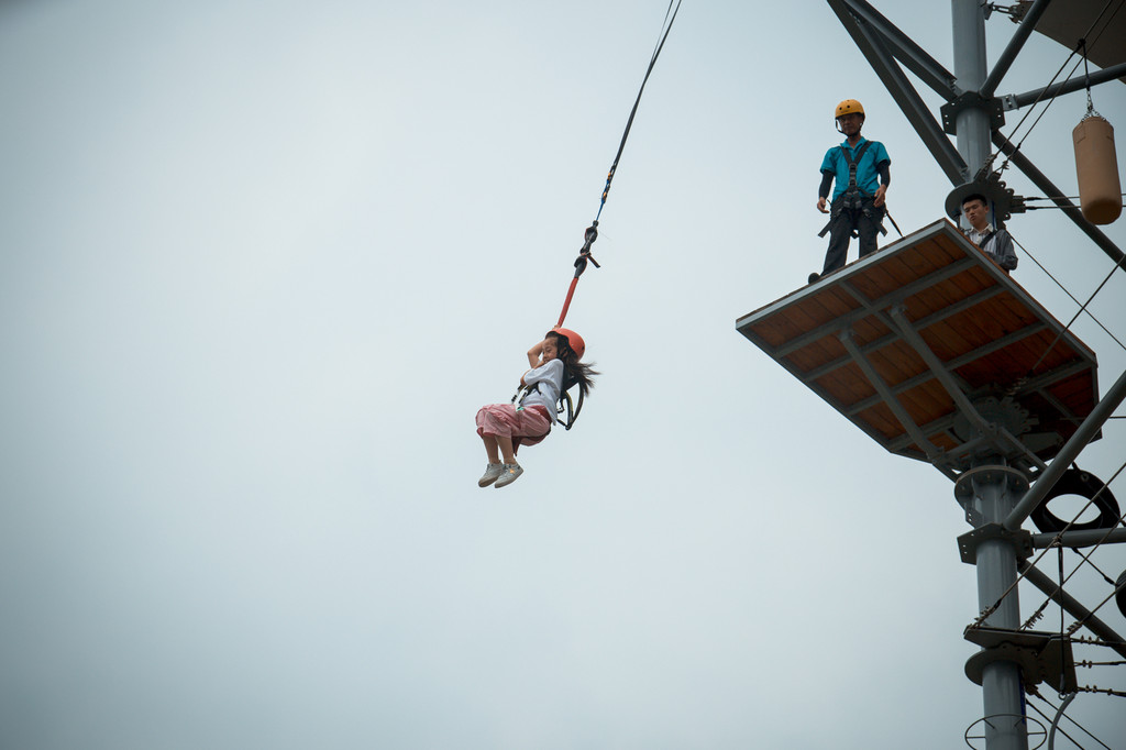 在这座探险塔里,居然还有一个蹦极项目,虽说不高,但站在上面跨出第一步也是有些困难的!因为我也去体验了一把,总觉得女儿成了心里的勇士,觉得挺自豪的!