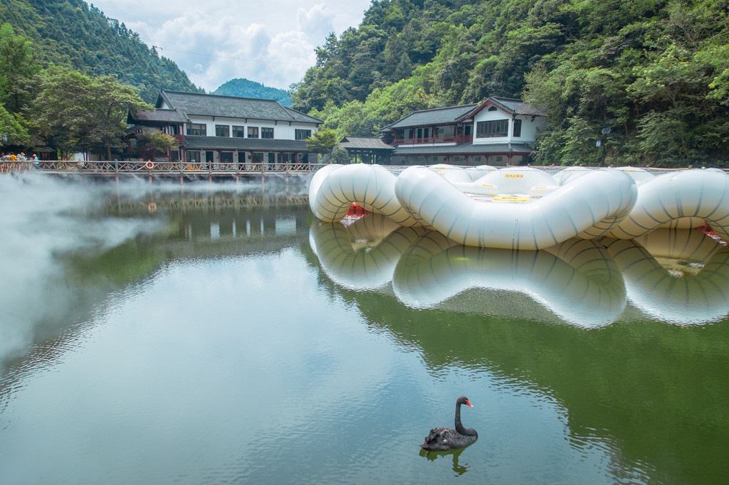 走在这云雾里,恍惚间,真的像穿越到了天上人间,天子村湖畔边,一只黑天鹅在痴痴地等待,听说它的伙伴被大水冲走了......湖畔边还有着水上餐厅,可边欣赏湖景纯色,边品尝特色美食。