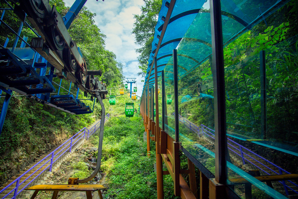 第一次乘坐魔毯,是倒着坐上山的,挺悠闲的,仍由身边层峦叠翠的林海擦肩,一派原始山谷风光尽收眼底,绿油间,感受到了夏季里的一丝凉爽。