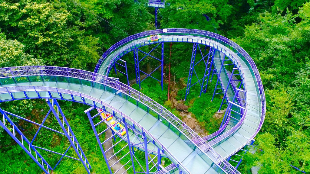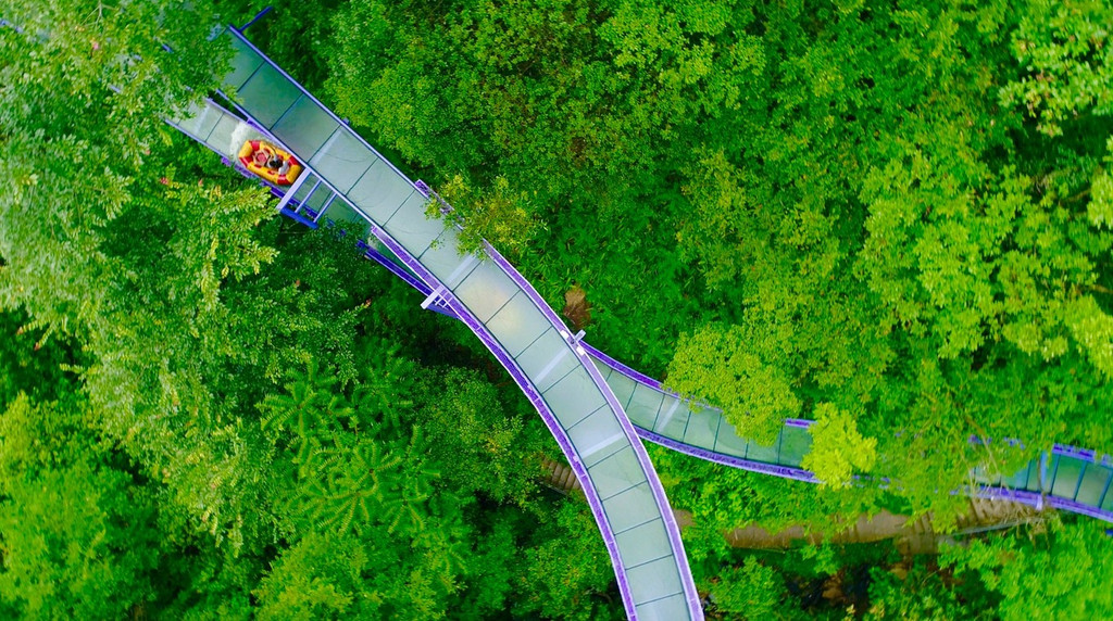 立体式的玻璃漂流,盘旋在山林之间。顺势而下,感觉像飞翔在绿色森林海洋中。穿梭在茂密丛林之间,弯多险急的S型玻璃栈道设计带给游客们非同寻常的速度与激情。