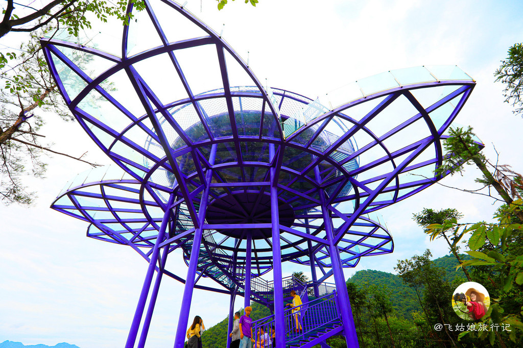 ?紫色的【 紫金 花悬崖玻璃跳台】:一个以“ 紫金 花”为主题的天空之镜,600平米无框玻璃(也已申请世界吉 尼斯 纪录)。从空中俯瞰形若一朵绽放的 紫金 花点缀于群山环抱之中。