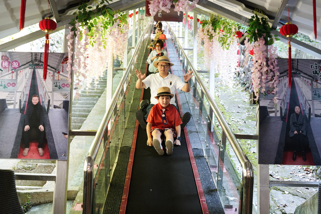 富春云梯是游玩富春桃源景区的第一站,据说是华东首创,乘坐魔毯电梯穿梭山间,不用爬山,轻松省力,解放双腿欣赏风景,是游客们的偷懒神器没错了。