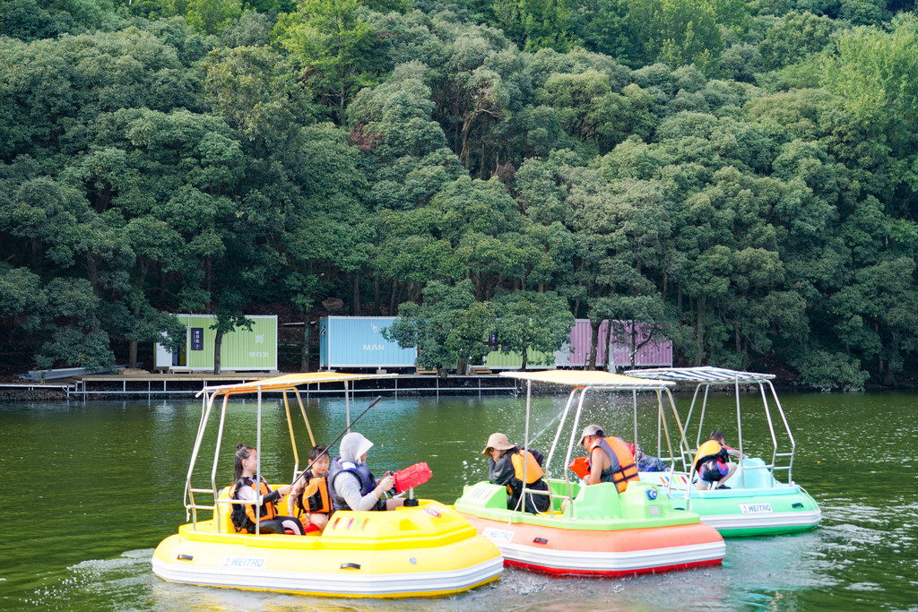 同时也开辟了一块可供低龄小朋友游玩的浅水区,有香蕉船,鲨鱼船等等,颜色亮丽,满眼都是多巴胺的快乐。