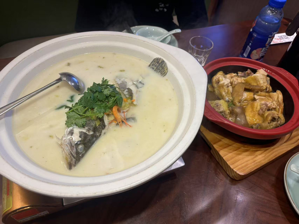 晚上:18:25步行前往瑶琳路,原先想去打卡网红的传承三十九年的老太婆饭店,19:15抵达时被店员告知已暂停取号服务,只得作罢;前往同路人(浙江省杭州市桐庐县桐君街道瑶琳路197-1号)就餐,他家的状元酥是一绝、米汤桂鱼是招牌、每天限量供应的秘制神仙鸡……