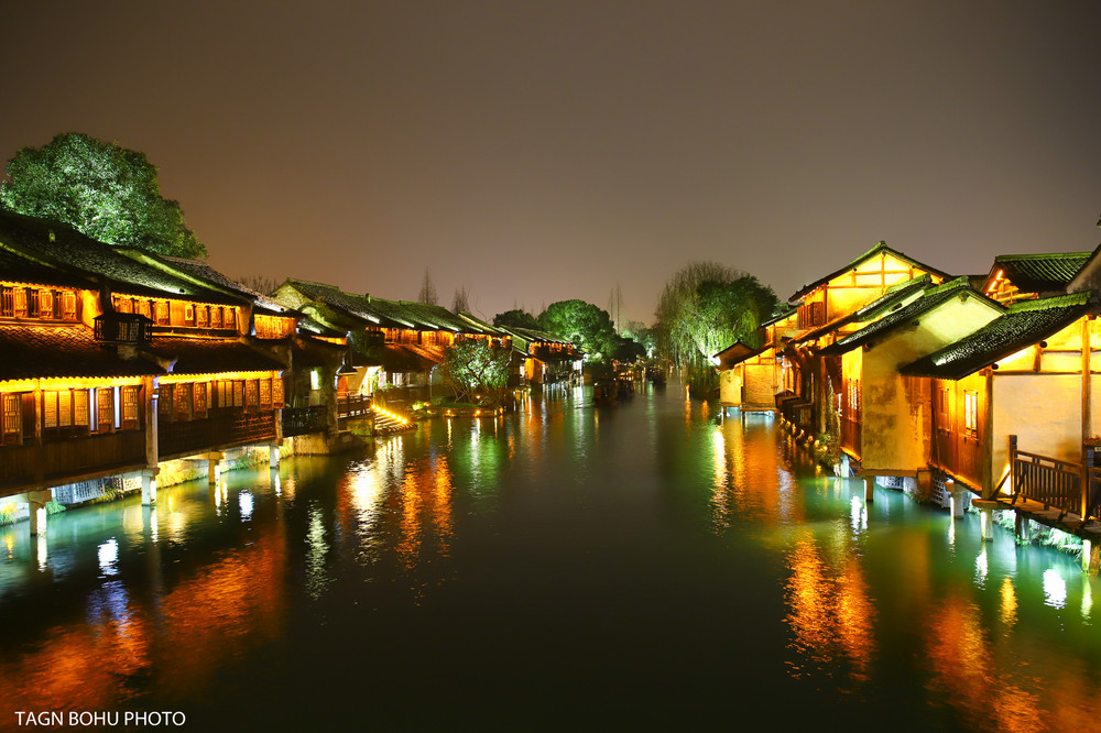 乌镇 具有七千余年悠久历史,京杭大运河在镇外流淌着,纵横交错的内河把小镇分为了东、西、南、北四栅,白天的 乌镇 西栅和晚上的 乌镇 景色各不一样,在傍晚的时候游客反而更多的进入景区,原因就是看 乌镇 的夜景,此时的 乌镇 西栅,像一个远离尘世的美丽少女,不施脂粉,别有风情。