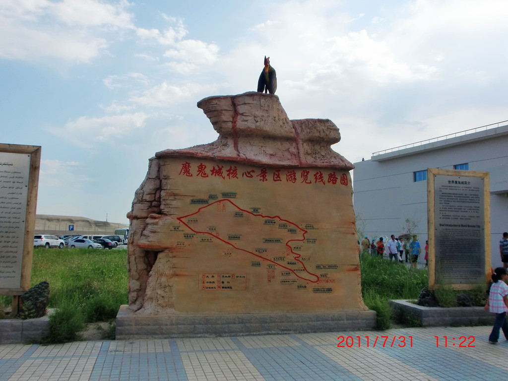 景区内是典型的雅丹地貌,在戈壁之上一座座形状各异的巨大石柱并列,有的像动物,有的像人,各有特色,非常的壮观雄伟。