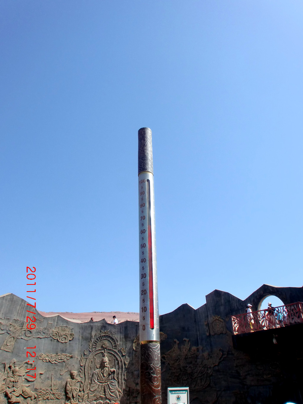 远处那是孙猴子的塑像,应该是在观察温度计的指数。