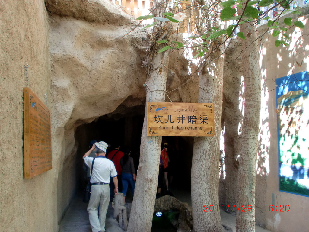 坎儿井是古代新疆人创造的地下水利灌溉工程,由于西北地区地质干旱、水源较少,因此坎儿井这项工程的创造变成了荒漠地区的生命之源。坎儿井与长城、京杭大运河并称为中国古代三大工程。早在《史记》中便有记载,时称"井渠",维吾尔语称之为"坎儿孜",它是荒漠地区一特殊灌溉系统,普遍于中国新疆吐鲁番地区。坎儿井是由:竖井、暗渠、明渠、涝坝四个部分组成。