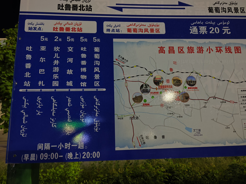 亚尔巴扎是个集市,好像只有周六日有,具体可以问司机。去火焰山和葡萄沟是另一个专线,问司机直接给我领到了车前,票价往返50,在火焰山等1个小时,可以把背包放车上,准时开车,不等。回程做的就是这趟车,一站火车站。在火车站坐这个专线车去其他几个地方。回来比较早,在司机的建议下。我们4个坐了1路去了坎儿井游乐园。