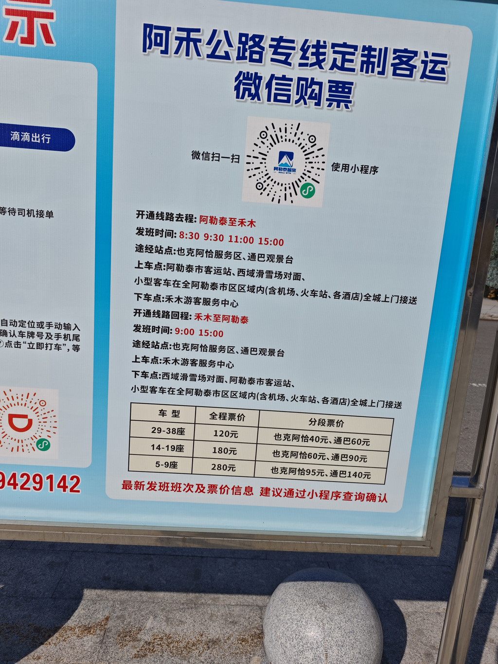 9月12日到阿勒泰。火车站有巴士到市里,这个巴士是配合火车开的,错过就等下趟火车。我着急去厕所,错过了,不想等18:20那趟,打车走了,去客运站附件找住的地方。司机说现在的阿勒泰已经到了:早穿皮袄,午穿纱,围着火炉吃西瓜的时候。客运站和我住的小宾馆背靠背,司机特意带我去了客运站。那边的小店就是三室一厅住10个人改造的那种,看前台就能知道屋里环境的那种,爱干净的别到这里。我和衣而卧一夜。放下行李直接去了客运站订明天到禾木的票。直接到禾木是240,如果退票有手续费,教训啊。有个工作人员建议我到布尔津在去禾木150。客运站也有150早上走的,订不到了,要两天后才有。这个时候有3个女的想包车走阿禾公路,拉我一起包车,早7点半走,最后谈到960包车。