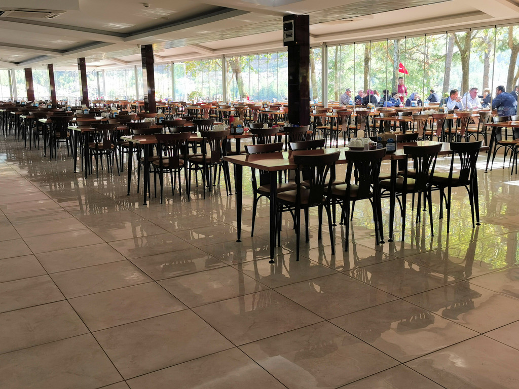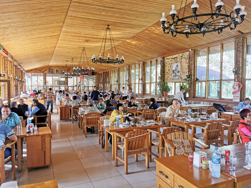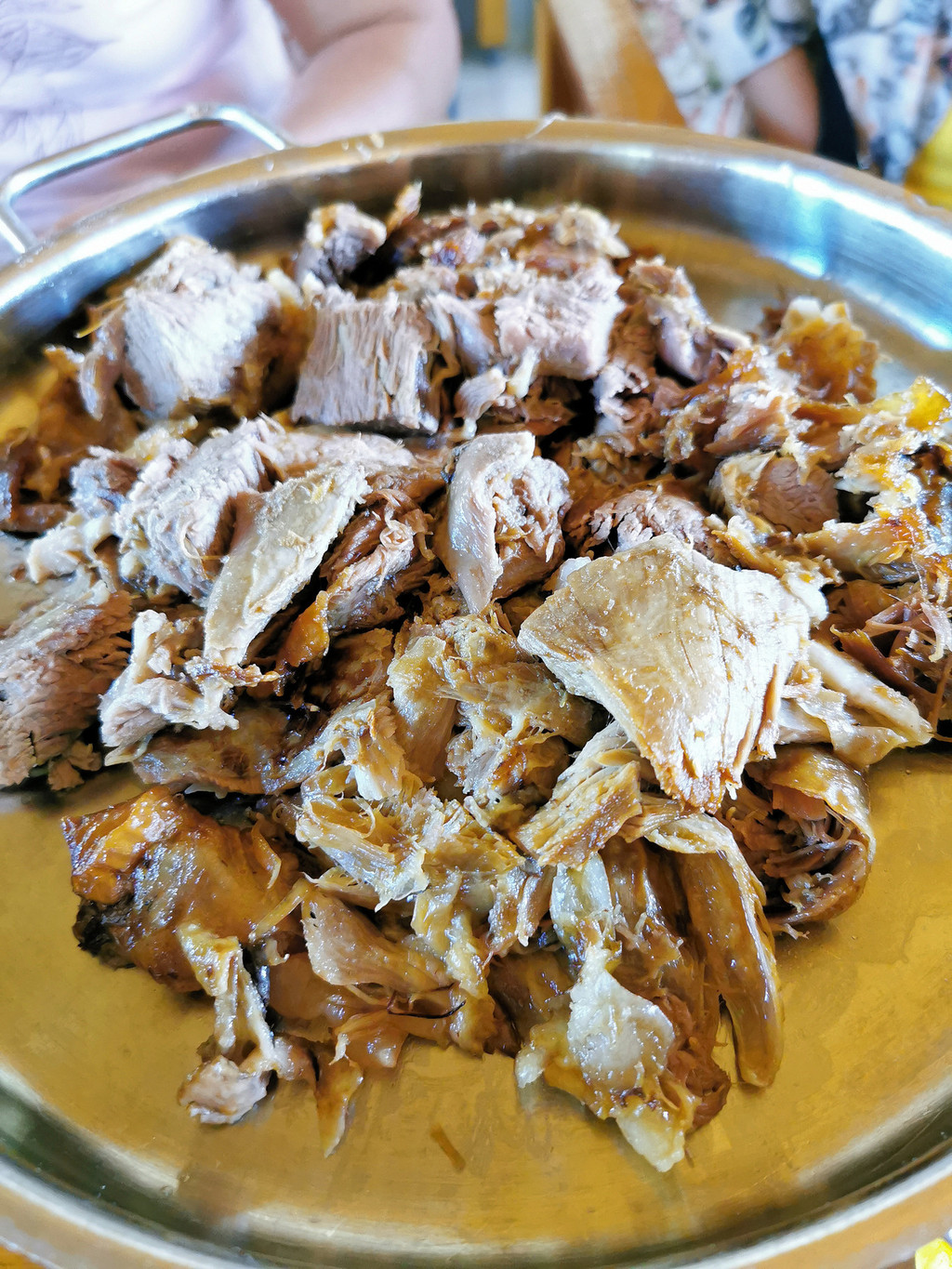 烤羊肉终于姗姗来迟,迫不及待地卷进馕中,哎哟喂!好吃啊!两卷下肚后,才想起来吃东西要有风度些。先在馕上涂些店家自制的酸辣酱,不是很辣,加上些酸酸的味儿,开胃啊。又是两卷,摸摸有些凸起的肚子,嗯,差不多了。此时才有心思端详餐馆的环境。里面拍了几张照片,为美餐留个念想。走出餐厅,哇!看到烤羊肉的地方啦。不大一间四面玻璃窗的小屋,中间是个铁盆烧着木柴,上面悬着两头羊,在慢慢地转。正巧有位厨师过来看烤的如何,我问能不能进去拍张照片,他笑着回答:木有问题啊!推开门进去,好热啊!赶紧照两张像就出来了。上大巴后有团友问,老木,吃了多少烤羊肉啊,怎么浑身都是肉味儿?!我晕!
