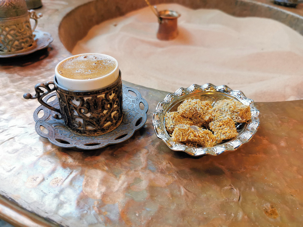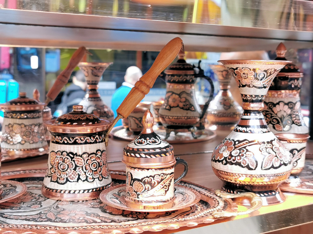 在一座有上千年历史的塞尔丘村,品尝了地道的土耳其咖啡。今日风靡世界的饮品咖啡,乃是土耳其人最早将其作为提神醒脑的饮料喝的。与法国打仗,军队撤离后,扔下多少麻袋咖啡豆。法国佬一开始以为是喂马的特别饲料,没想到一尝之后,完喽!上瘾啦!自此,咖啡开始在欧洲泛滥,直至传遍全球。冲泡咖啡有多种方法和工具,土耳其仍然保留着最原始的用热沙子来烧咖啡的传统。