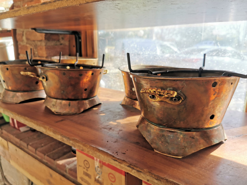 1美元一杯,免费甜品。图片上部,沙盆中的小铜壶就是用来煮咖啡的。