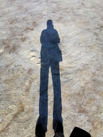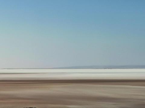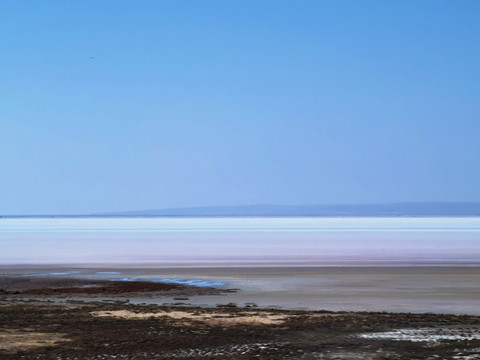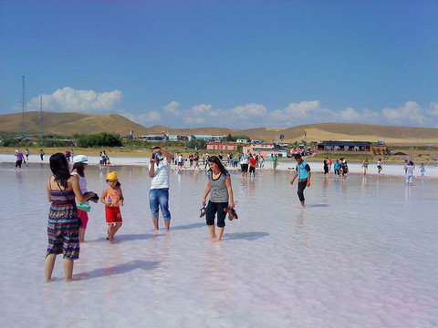 到了湖边,够大,一眼望不到边,远处与天相连。近处的湖面上很多人,都是旅游团。走到滩涂上,果然,泥底加杂着白色的颗粒。再往里走,就是全白色了。我们来的时候是十一月中,是枯水季,要是春夏,恐怕就是另一番景象了。越往里面走,白色的盐层就越厚,直接用铲子铲就可以装车了。