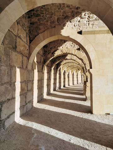 终于开门放行了。穿过一道长长的拱顶通道后,眼前豁然开朗。半圆形的大剧场,一层层观众座席,都是石条的纯粹硬座啊!我决定“登顶”去拍几张俯瞰图。呼哧喘喘的到了最高一层,往下看,哇,漂亮!一览无余的剧场完美无缺,不像其它的遗迹,大多是断壁残垣的。舞台后面高大的影壁起到了很好的拢音和回声效果。