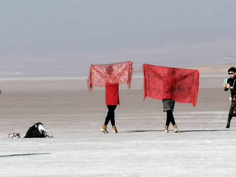 这里还是鸟类的乐园,最壮观的是成千上万只火烈鸟来此度假,绝对艳丽无双。好在那天在盐湖上也看到了鲜红色,是两位神州大妈展开了胜利的纱巾,双手平展拉开,腿别着,或者说是交叉着,笔者不知道该如何描述那个姿势,反正就是很厉害的那种!