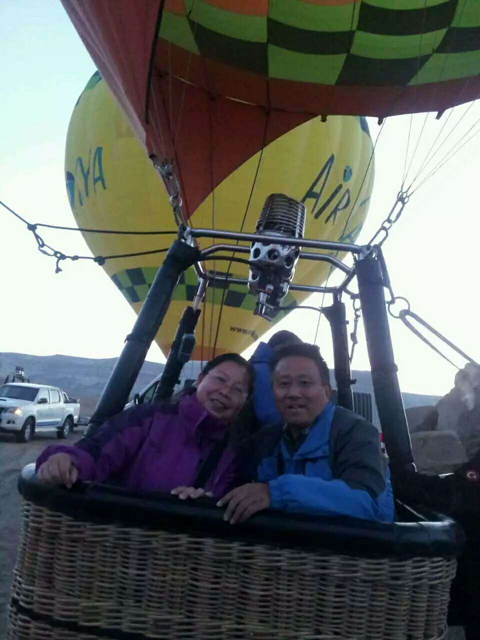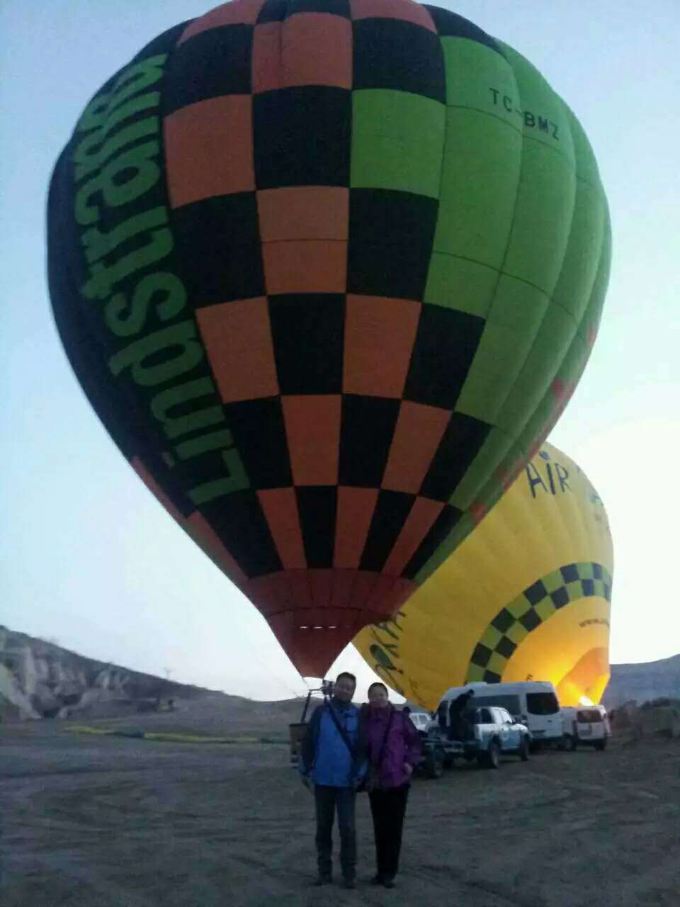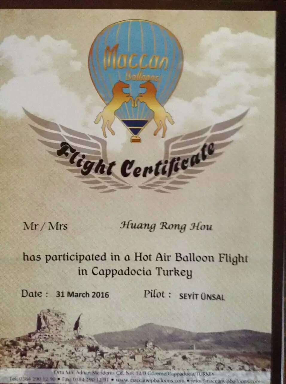 令人惊叹的热气球之旅,终生难忘的经历!我们时而在七百多米高空盘旋,俯瞰状如月球表面的地貌。时而在山谷延岩石穿梭,近观不同色彩的山谷。六百万年火山灰形成的杰作,感叹大自然的鬼斧神工!今天天气格外晴朗,驾驶员塞义夫是前土耳其空军飞行员出生,驾驶热气球技术高超,既能飞到很高的高度,又能贴近地面飞行,最绝的是一次性直接软着落在拖车上。他为人特幽默。问我们是不是第一次坐热气球。当我们回答是时,他笑道他也是。其实他驾驶热气球八年,二千四百多次,零事故!他还说他气球的小名叫泰坦尼克!他的风趣一下子缓解了一点点的紧张气氛!同坐气球的二𠆤瑞士女孩略显拘谨!按传统我们降落后塞义夫开了瓶香槟,酒喷在我们身上祝福我们今后幸运。并且还给我们颁发了证书。难怪美国国家地理杂志把这儿热气球之旅评为世界十大激动人心之旅,与地球北极之旅,西藏珠峰之旅齐名!名符其实!